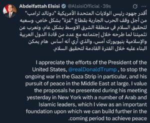 *“أُقدر جهود رئيس الولايات المتحدة الأمريكية دونالد ترامب من أجل وقف الحرب الجارية بقطاع غزة بشكل خاص، وسعيه لتحقيق السلام في منطقة الشرق الأوسط بشكل عام، ونعرب عن تثميننا لما طرحه خلال اجتماعه مع عدد من قادة الدول العربية والإسلامية بنيويورك أمس، والذي أرى أنه أساس هام يمكن البناء عليه خلال الفترة القادمة لتحقيق السلام.”*