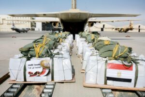 أقلعت 9 طائرات نقل عسكرية من جمهورية مصر العربية على مدار الثلاث أيام الماضية محملة بعشرات الأطنان من المساعدات الغذائية لتنفيذ أعمال الإسقاط الجوى على المناطق التى يصعب الوصول إليها براً بقطاع غزة ، جاء ذلك تزامناً مع الجهود المصرية لإستمرار تدفق شاحنات المساعدات براً .